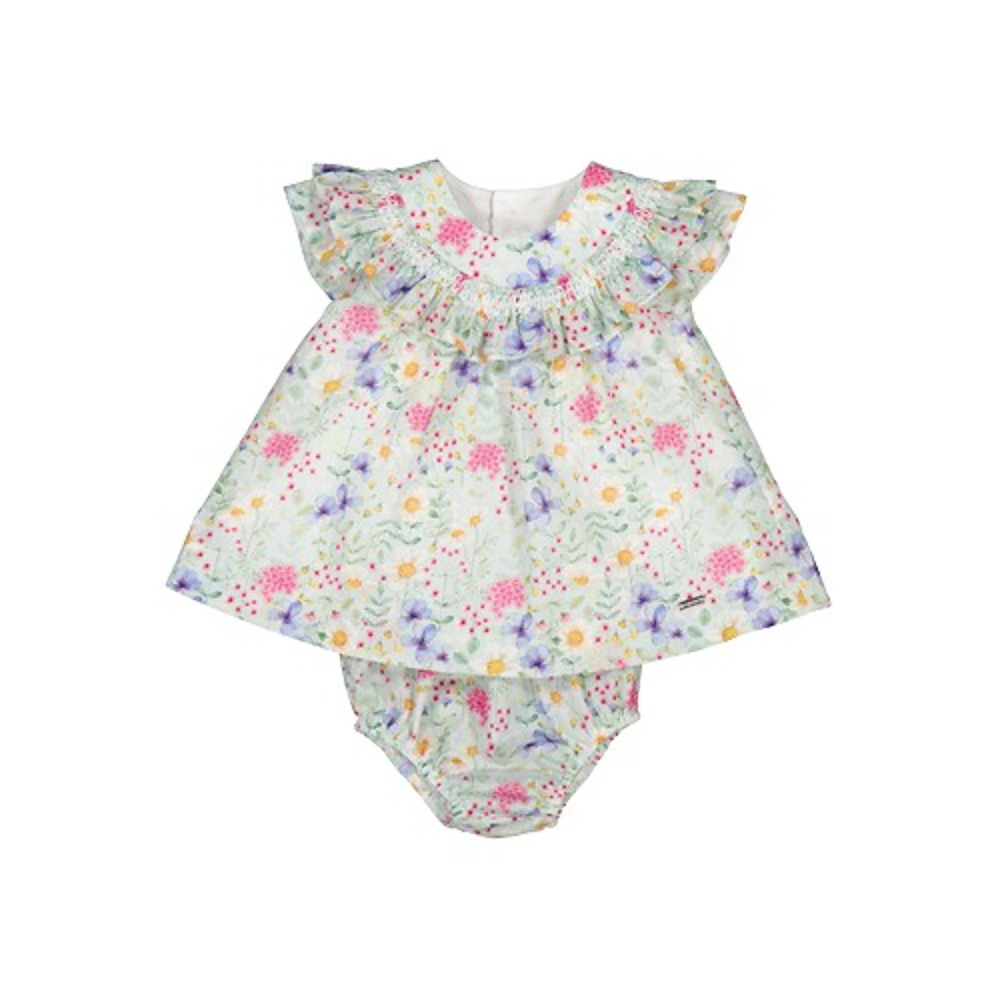 Lief baby jurkje met bloemetjes print van Mayoral. Het jurkje heeft een mooi halsje en sluit aan de achterkant met knoopjes. Met bijpassend luierbroekje.