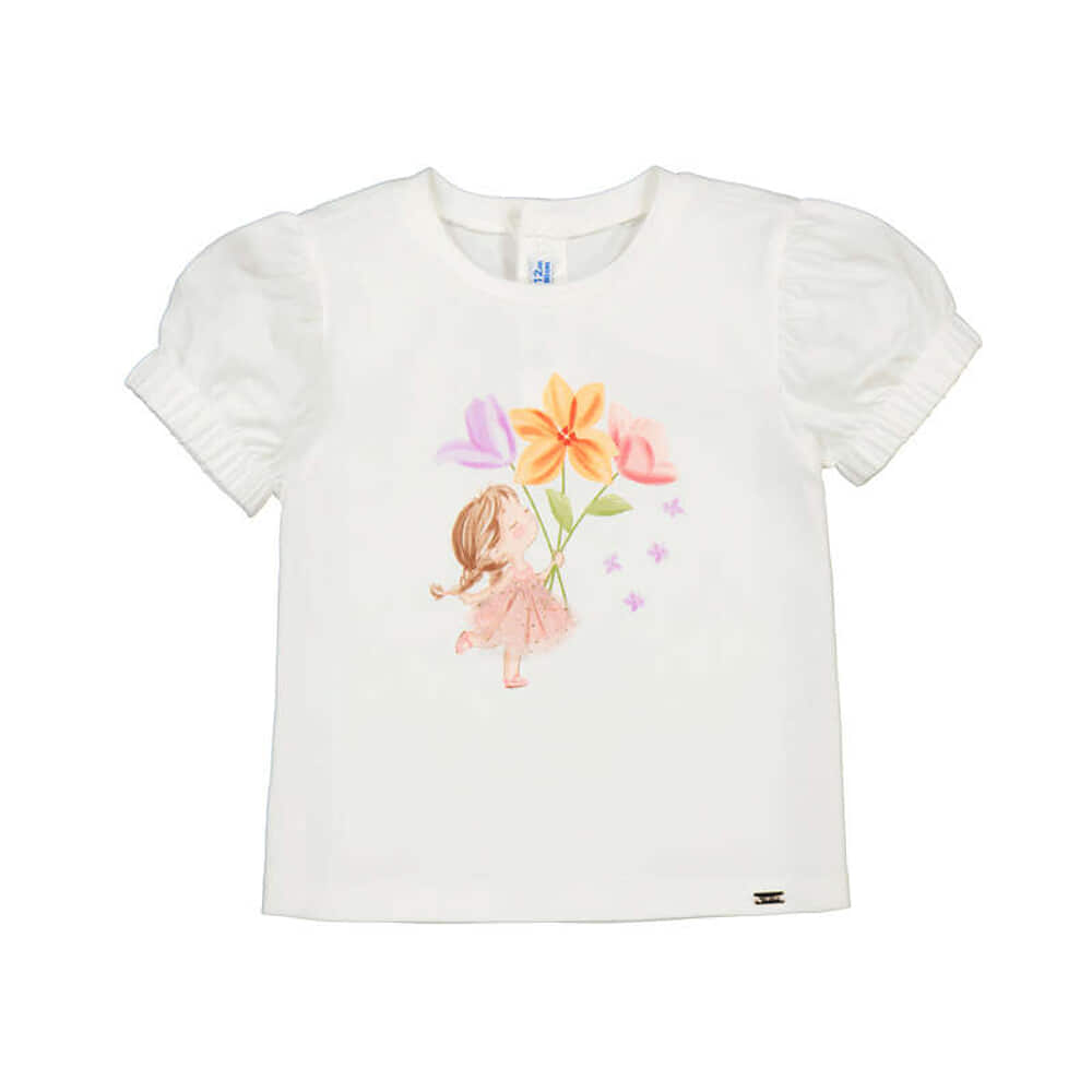 Mayoral creme tshirtje met meisjes print. Het meisje heeft een tule rokje aan en heeft bloemen in haar hand. Bijpassend tule rokje ook bij ons verkrijgbaar.