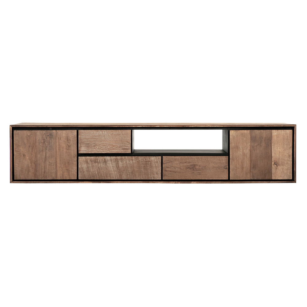 TV-meubel hangend Memphis is gemaakt van teakhout en afgewerkt met een zwart metalen frame, dit zorgt voor een industriele uitstraling. De kast heeft 2 deuren, 3 lades en 1 open vak.