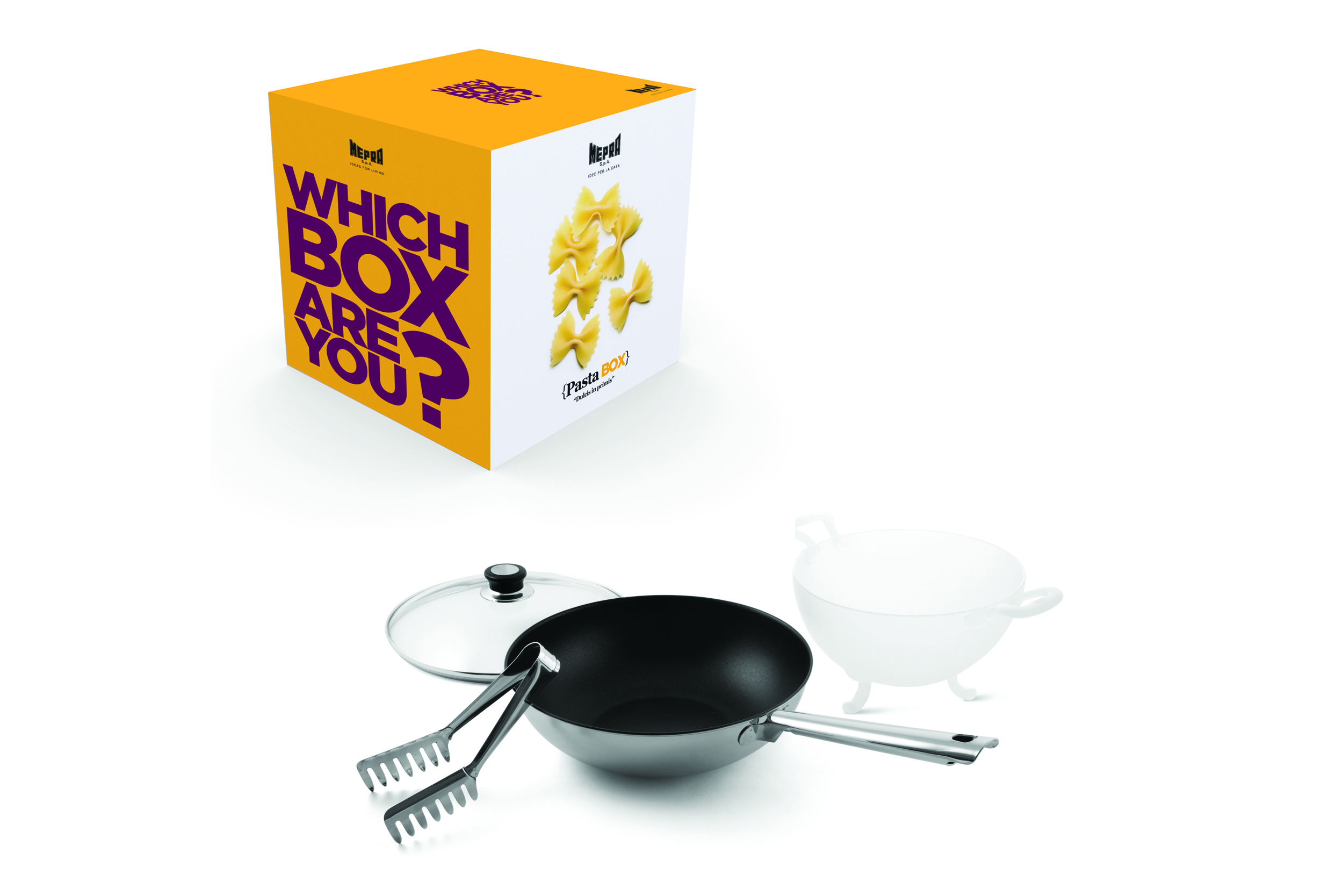 De box voor echte pasta liefhebbers bestaande uit:- Wok ø 28 cm met anti-aanbaklaag en geschikt voor inductie- Glazen deksel passend op de wok- Handige knijptang voor het eenvoudig serveren van pasta- ‘Trediscima’ vergiet ø 22 cm