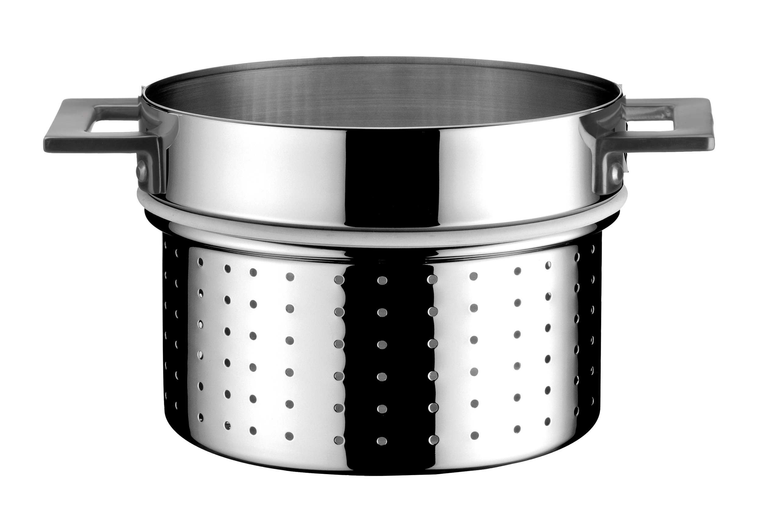 Met deze Italiaanse pasta inzet, maakt u echte Italiaanse pasta. Om pasta te kunnen bereiden is naast deze pasta inzet ook een hoge pan benodigd. Deze is ook beschikbaar in de Mepra Attiva serie.Algemeen is het zo dat pasta altijd in ruim water moet worden gekookt. Na het koken giet u de pasta af. Met een ruime hoeveelheid pasta en nog meer kokend water is dat een lastige en gevaarlijke klus. Dat is de reden dat de Italianen de pastapan hebben ontwikkeld. Kooktip: Voeg eerst zout toe aan het kokende water en plaats daarna pas de inzet in de pan. Als u eerst de inzet plaatst en daarna zout toevoegt kan er te veel druk ontstaan die gevaarlijke bewegingen van het kokende water veroorzaken zodat het over de rand golft.De pannen uit de Attiva serie zijn ’tri-ply’ en daarmee hebben deze luxueuze pannen een uitstekende warmte verdeling. Dit zorgt er voor dat het voedsel in de stoominzet volledig en van alle kanten verwarmd wordt. Ook zal de warmte langer worden vastgehouden, ook zonder dat de warmtebron nog aan staat.In het design van de pan zijn ronde strakke vormen gecombineerd met een vierkant handvat. Dit zorgt voor een luxe uitstraling en kenmerkend en uniek design. Deze Attiva pasta inzet is vervaardigd volgens de Mepra normen: professionaliteit in het fabricageproces gecombineerd met een luxe en chique uitstraling.
