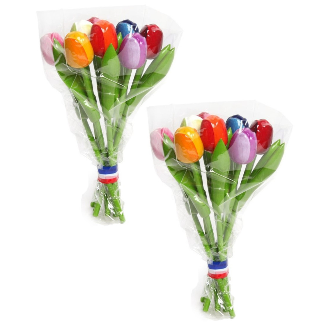 Houten tulpen decoratie boeket van 20 cm – 2x stuks – Gekleurde tulp bloemen – — Merkloos