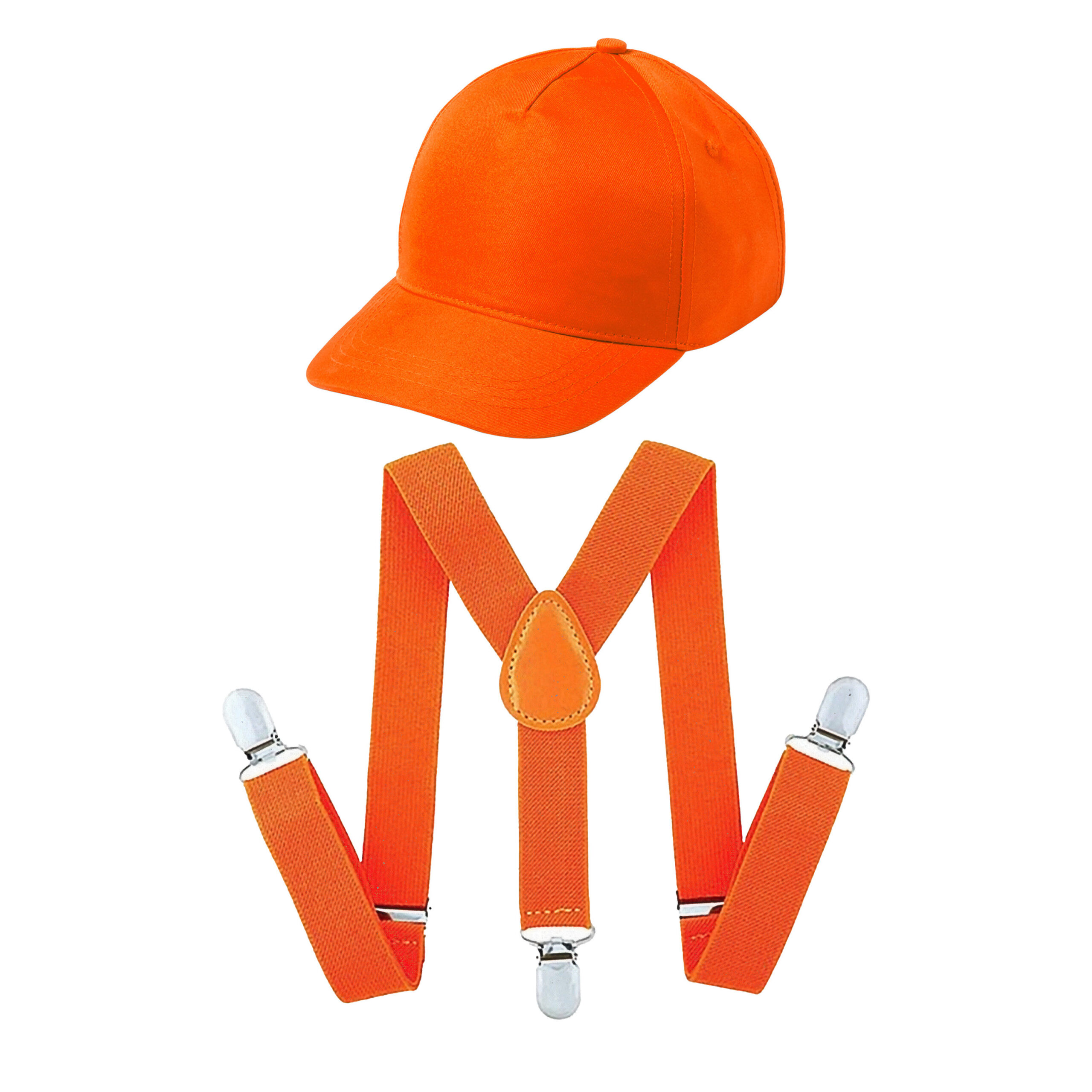 Bekijk product bij Trendmax.nl — bestel vandaag nog en ontvang de Koningsdag/sport verkleed set compleet – baseballcap en bretels – oranje – heren/dames snel thuis.