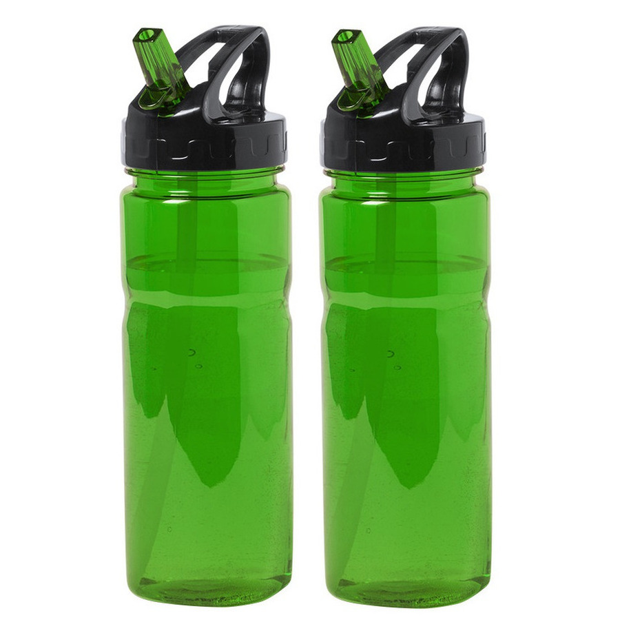 2x stuks kunststof waterfles/drinkfles/sportfles/bidon in de kleur groen transparant met drinktuit en schroefdop. Afmeting: ca. D7 x H23 cm. Inhoud: ca. 650 ml. Gewicht: ca. 115 gram. Materiaal fles: Tritan kunststof. BPA-vrij: ja. Geschikt voor magnetron: ja. Geschikt voor vaatwasser: ja. Geschikt voor vriezer: ja. Sport bidon flessen voor kinderen en volwassenen.