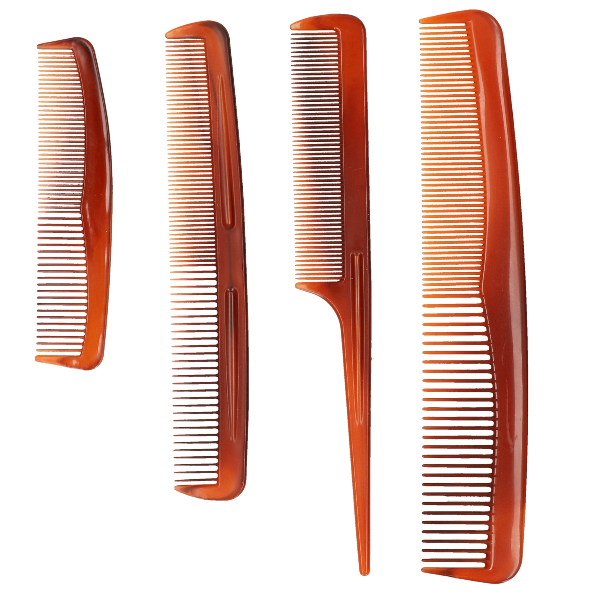 Professionele haar kammenset 4 delig in de kleur bruin. Set bestaande uit 4 stuks verschillende kunststof haar styling kammen in diverse maten, waaronder 1 puntkam. Kleur: bruin.