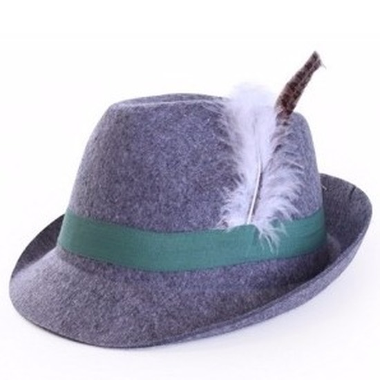 Grijs Tiroler hoedje Anton verkleedaccessoire voor volwassenen. Tiroler/bierfeest/Oktoberfest feesthoedje in gemeleerd grijs met groen lint rondom en een veren detail. Materiaal: vilt, polyester, echt Meer info →
