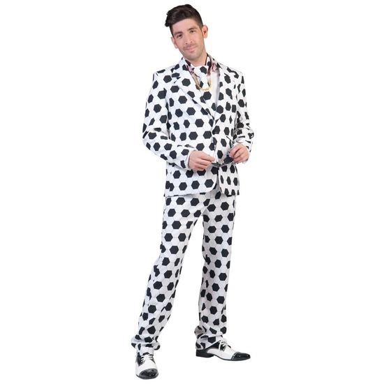 Voetbal thema print voor heren, feest kostuum. Dit verkleedkleding kostuum met print van voetballen bestaat uit een broek, colbert en stropdas. Materiaal: 100% polyester. Voor mannen. Mormale pasvorm. Meer info →