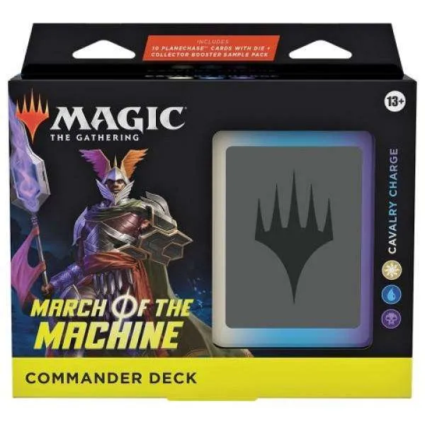 MTG March of the Machine Commander Deck – Cavalry Charge Cavalry Charge is het zwarte, blauwe en witte commander deck van March of the Machine! Build your arsenal, travel through Planes, and dominate the multiverse with March of the Machine. Are you ready to join the ultimate battle for dominance in the multiverse? Look no further than the March of the Machine Commander Deck .In this epic card game, Elesh Norn and her ruthless Phyrexians are invading multiple worlds, and it's up to you to stop them.With a deck of 100 blackbordered cards, including 10 never-before-released cards, you'll be able to build the ultimate arsenal to take on the Phyrexian army.But that's not all. The March of the Machine Commander Deck also includes two foil commanders, 10 Planechase cards (featuring five new and five reprint cards), a Planechase dice, a foil-etched display commander, 10 double-faced tokens, a 2-card Collector Booster Sample Pack, a cardboard deckbox for 100 sleeved cards, and a life wheel.And let's not forget about the Planechase variant, where you and your opponents can travel through different Planes with unique properties that affect gameplay. Roll the dice and see where your journey takes you.But that's not all. With tournament legal new cards in Vintage and Legacy formats, you can take your skills to the next level and dominate your opponents like never before.So, are you ready to march to victory?Join the fight and show the Phyrexians what you're made of with the March of the Machine Commander Deck .