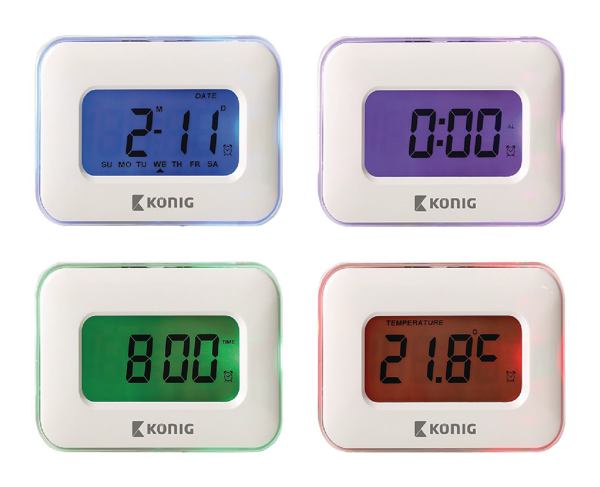 Multifunctionele alarmklok die datum, tijd en kamertemperatuur weergeeft en voorzien is van een timer en alarm. Iedere functie licht op in een andere kleur (lichtblauw, donkerblauw, lichtgroen, groen of rood) Alarmklok heeft een extra groot scherm en is daardoor duidelijk leesbaar, te bedienen door een lichte aanraking. Exclusief 3 AAA batterijen.