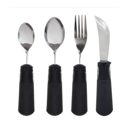 Norco Big Grip bestek set 4 delig buigbaar met verzwaard handvat. Set bestaat uit vork-eetlepel-mes en soeplepel. Dit bestek heeft zachte en schokabsorberende handvaten die ook bij vochtigheid een goede houvast hebben. De comfortabele grepen zijn tot 3,5 cm verdikt en gemaakt van zacht rubberachtig materiaal met flexibele ribbels die zich aan iedere hand aanpassen. De lepels en vorken kunnen in iedere gewenste hoek gebogen worden. Geschikt voor links- en rechtshandig gebruik.