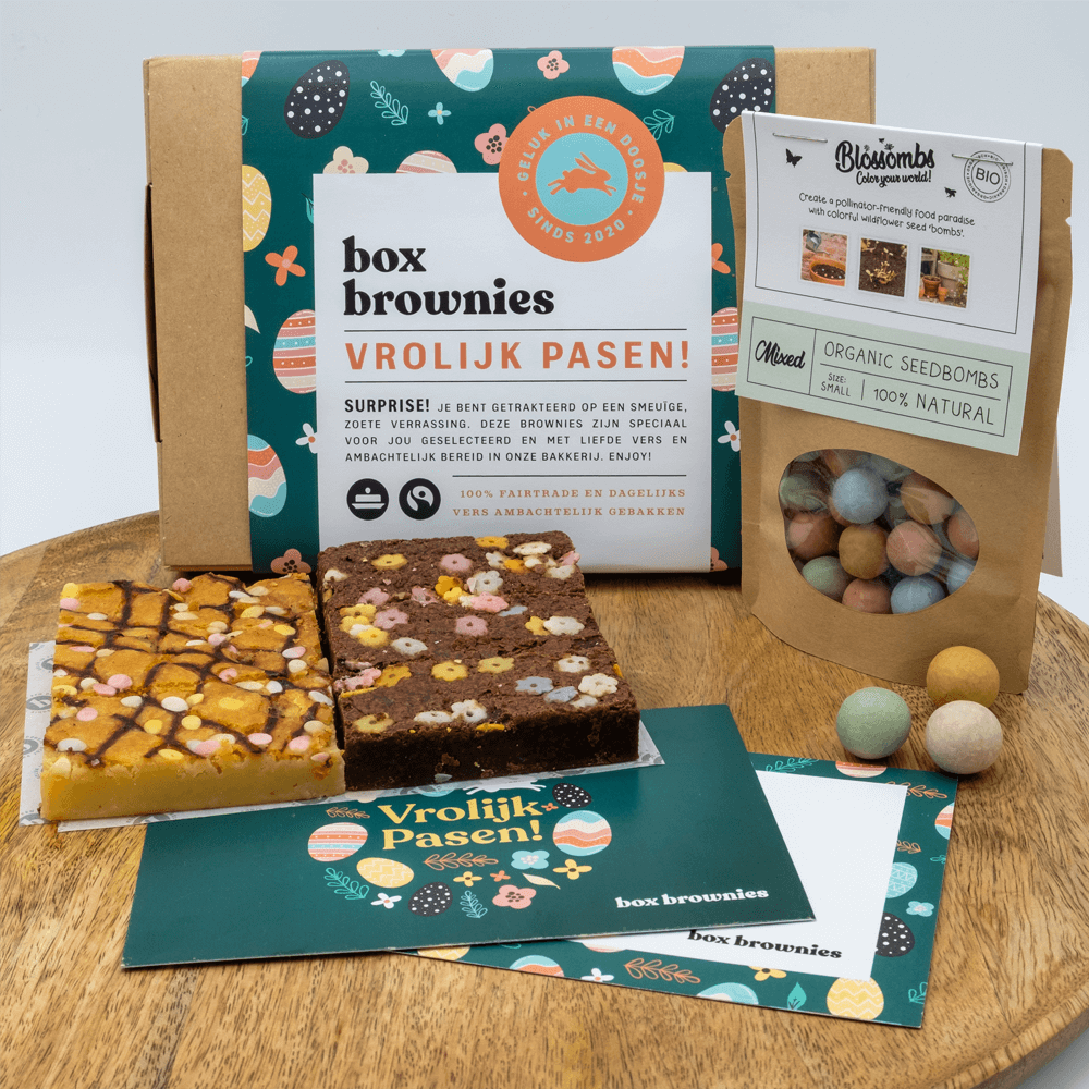 Vier Pasen met onze feestelijke Paasbox bloei – groot vol zoetigheid voor nu én iets bloeiends voor later! Deze box is gevuld met 6 heerlijke bars in de smaken: Paas Sprinkles Brownie (3 bars) met knapperige bloemen sprinkles en Framboos Blondie (3 bars) met paasei sprinkles. Daarnaast bevat de box 25 Blossombs zaadbommetjes. Blossombs zijn biologische, kleurrijke bommetjes vol bloemenzaad voor bijen en vlinders. Leg de Blossombs buiten in de tuin, op een braakliggend stukje grond of in een pot op je balkon (vermijd natuurgebieden). Met een beetje water en geduld geniet de ontvanger later van de meest kleurrijke bloemen!De box is verpakt met een vrolijke paaswikkel en een (optioneel) gratis kaartje waarop je een persoonlijke boodschap kunt laten drukken. Zo is het extra leuk om een paascadeau per post te versturen! Bekijk ook onze andere cadeaus voor Pasen! De Paasboxen worden verstuurd zolang de voorraad strekt. OP = OP!