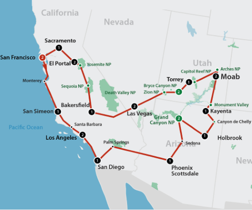 In een rustig tempo het zuidwesten van de Verenigde Staten verkennen? Dat kan tijdens deze 3 weekse autoreis. U bezoekt de wereldberoemde parken en de minder bekende, maar zeker interessante gebieden in Arizona en Utah. Begin aan een reis vol prachtige natuur en cultuur en duik in de rijke historie van de Native Americans die in deze gebieden leefden. U begint in steden als San Francisco, Los Angeles en San Diego, waarna u door de woestijn van Arizona rijdt. Vanuit Phoenix naar Canyon de Chelly en Monument Valley. Het prachtige natuurschoon in Arches, Capitol Reef, Bryce en Grand Canyon gaat vooraf aan ontspannende dagen in Las Vegas. Terug in Californië geniet u van Sequoia en Yosemite National Park.