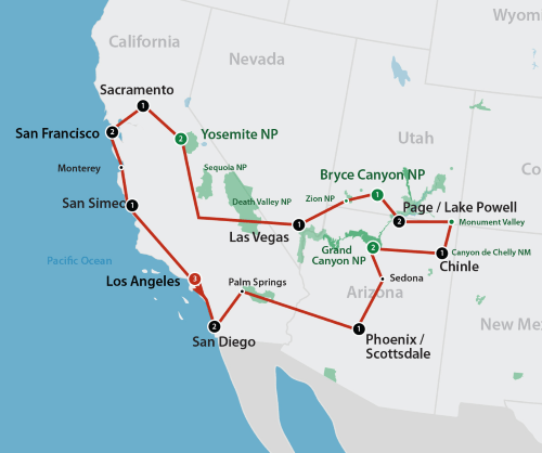 Een autoreis waarbij u in iets minder dan 3 weken de bekendste steden en parken van het westen van Amerika bezoekt. Wij hebben de mooiste locaties voor u uitgezocht; wat denkt u van Grand Canyon, Lake Powell en Yosemite National Park. Om u voldoende tijd te geven verblijft u telkens 2 nachten per locatie. Maar ook voor de steden als San Diego, San Francisco en Los Angeles is er voldoende tijd om te ontdekken. Ook het minder bekende Canyon de Chelly staat op het programma alwaar u het dagelijkse leven van de Navajo indianen kunt beleven. Bryce Canyon, Las Vegas en de 17-Mile Drive zullen echter ook niet ontbreken. Kortom; een reis met vele indrukken waarbij u ruim de tijd heeft op de meest gewilde locaties!