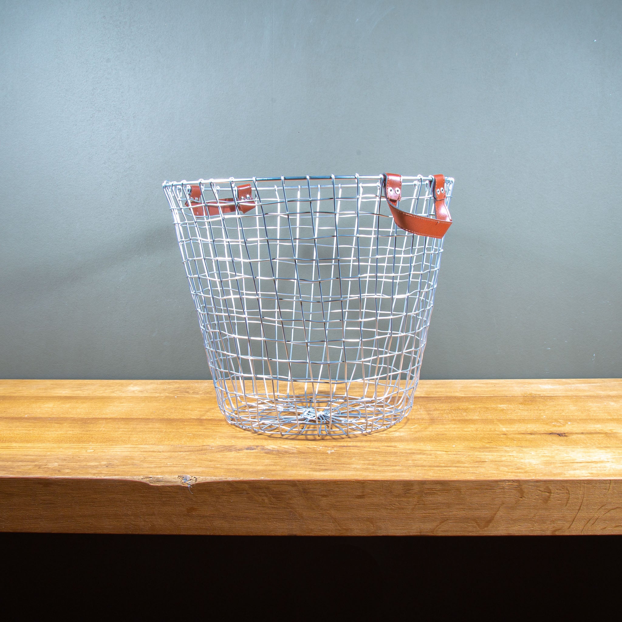 Zilveren draadmand geschikt voor productpresentatie binnen of buiten. Dankzij de leren handgrepen heeft deze mand een stoere en robuuste uitstraling. De mand heeft een diameter van 43cm en is 44,6cm hoog. Direct leverbaar (binnen 3 werkdagen bezorgd)