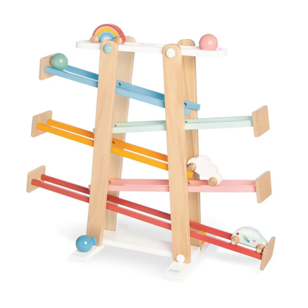 Laat het speelplezier rollen met deze houten knikkerbaan van massief beukenhout! Dankzij de stevige afwerking en tijdloze look is dit speelgoed dat lang gebruikt kan worden. Perfect voor kleine ontdekkers vanaf 3 jaar.Met vier kleurrijke knikkers, drie rolelementen en een autootje gebeurt er altijd iets nieuws. Kinderen kunnen spelenderwijs kennismaken met oorzaak en gevolg, terwijl ze elke keer opnieuw genieten van de bewegingen. Kenmerken:Massieve beukenhouten knikkerbaan, stevigAfgewerkt in blank en kleurrijk gelakt hout9-delig: 1 knikkerbaan, 4 gekleurde knikkers (Ø 45 mm), 3 rolelementen, 1 autoGeschikt om motoriek, fantasie en ontdekking te ondersteunenAanbevolen voor kinderen van 3 tot 6 jaar
