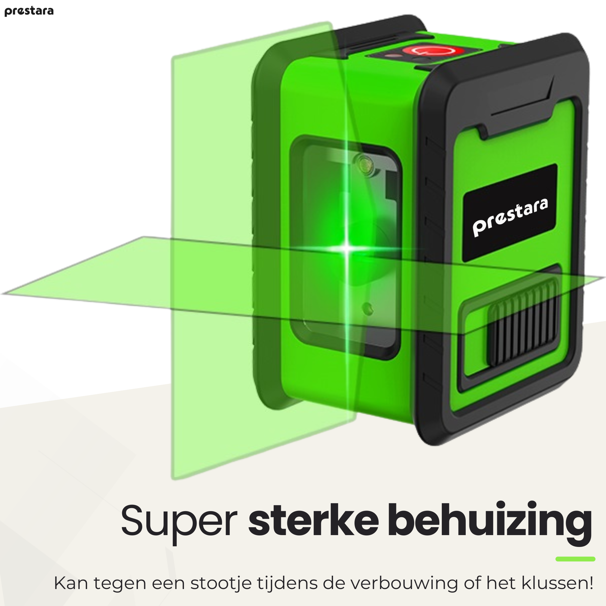 Zelfnivellerende Kruislijnlaser met Groene Lijnen: De Prestara kruislijnlaser nivelleert zichzelf automatisch voor horizontale en verticale precisie, met een nauwkeurigheid van +/- 0,8 mm per meter en een zelfnivelleringsbereik van ± 5°. Een indicatorlampje geeft aan wanneer het apparaat niet waterpas staat (rood) of goed is uitgelijnd (groen).