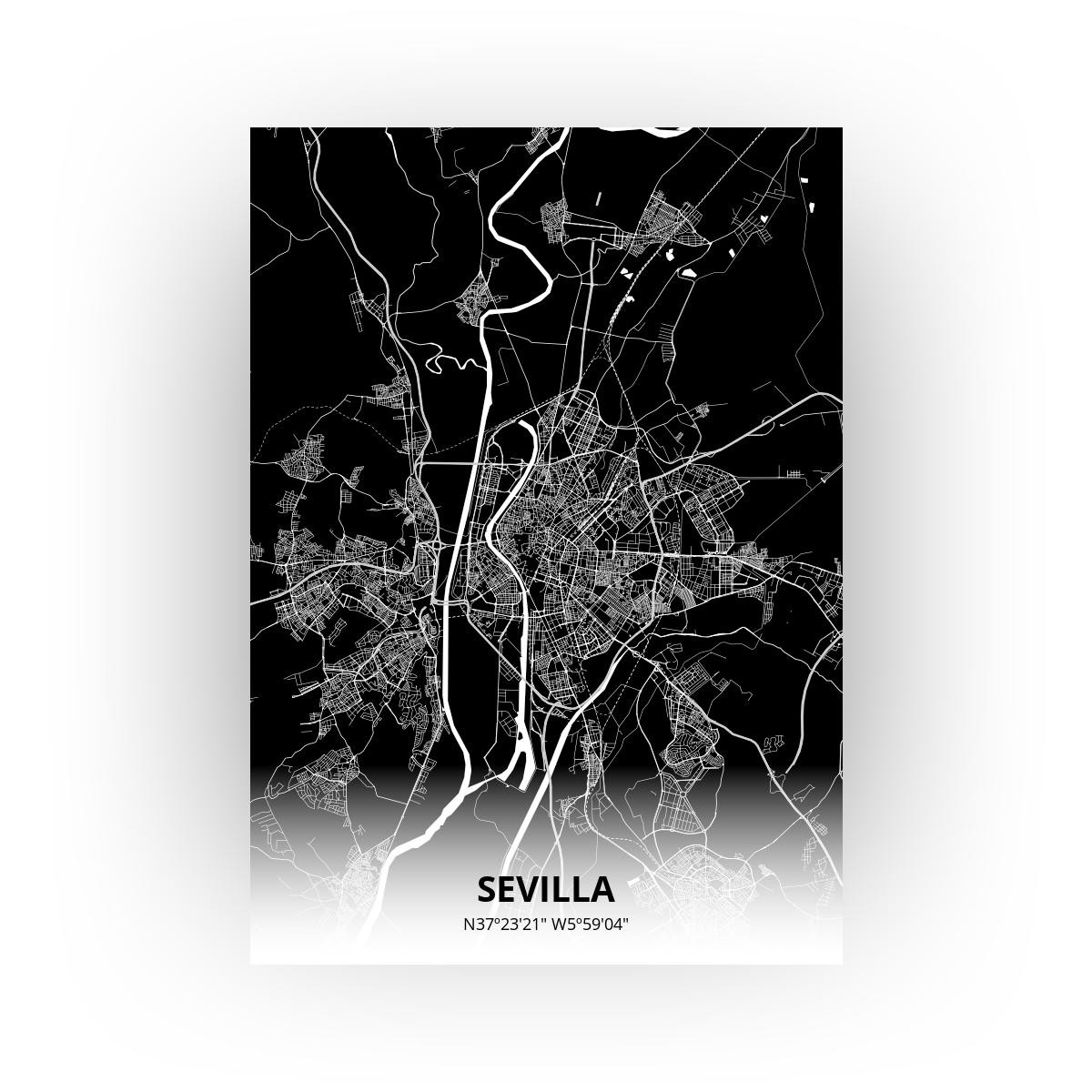 Bekijk product bij Printmijnstad.nl — bestel vandaag nog en ontvang de Poster Sevilla Plattegrond – A4 – Zwarte stijl snel thuis.
