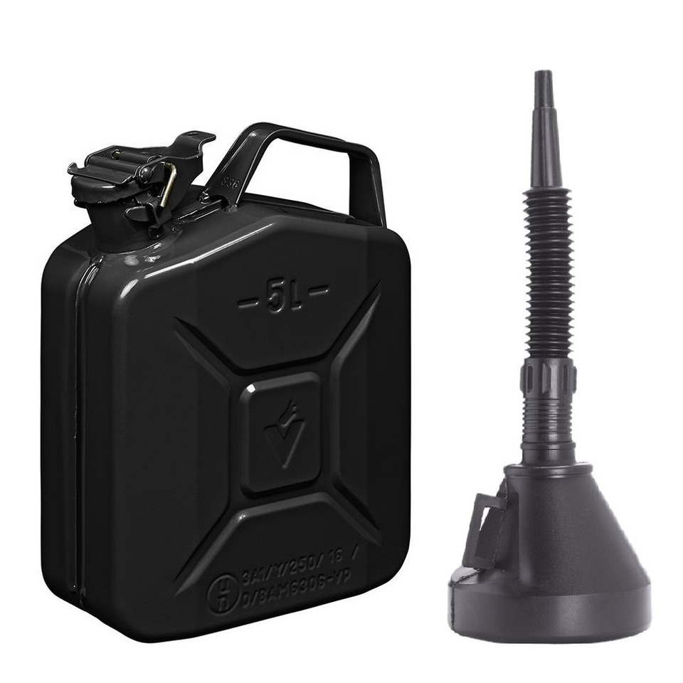 *Metalen grote Jerrycan zwart voor olie en brandstof van 5 liter met een handige grote trechter van 39 cm.*