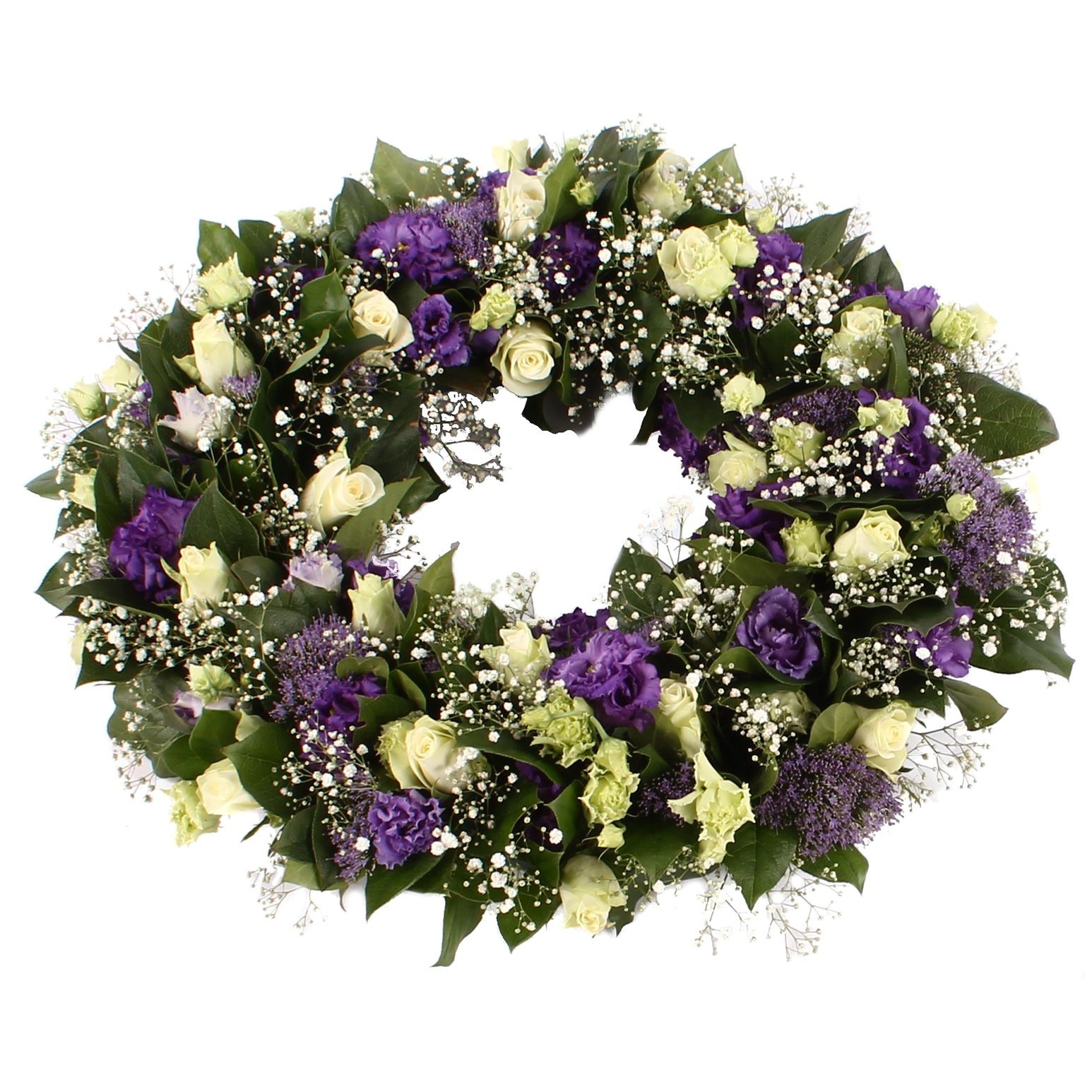 Ajourkrans wit paars — Rouwboeket.nl