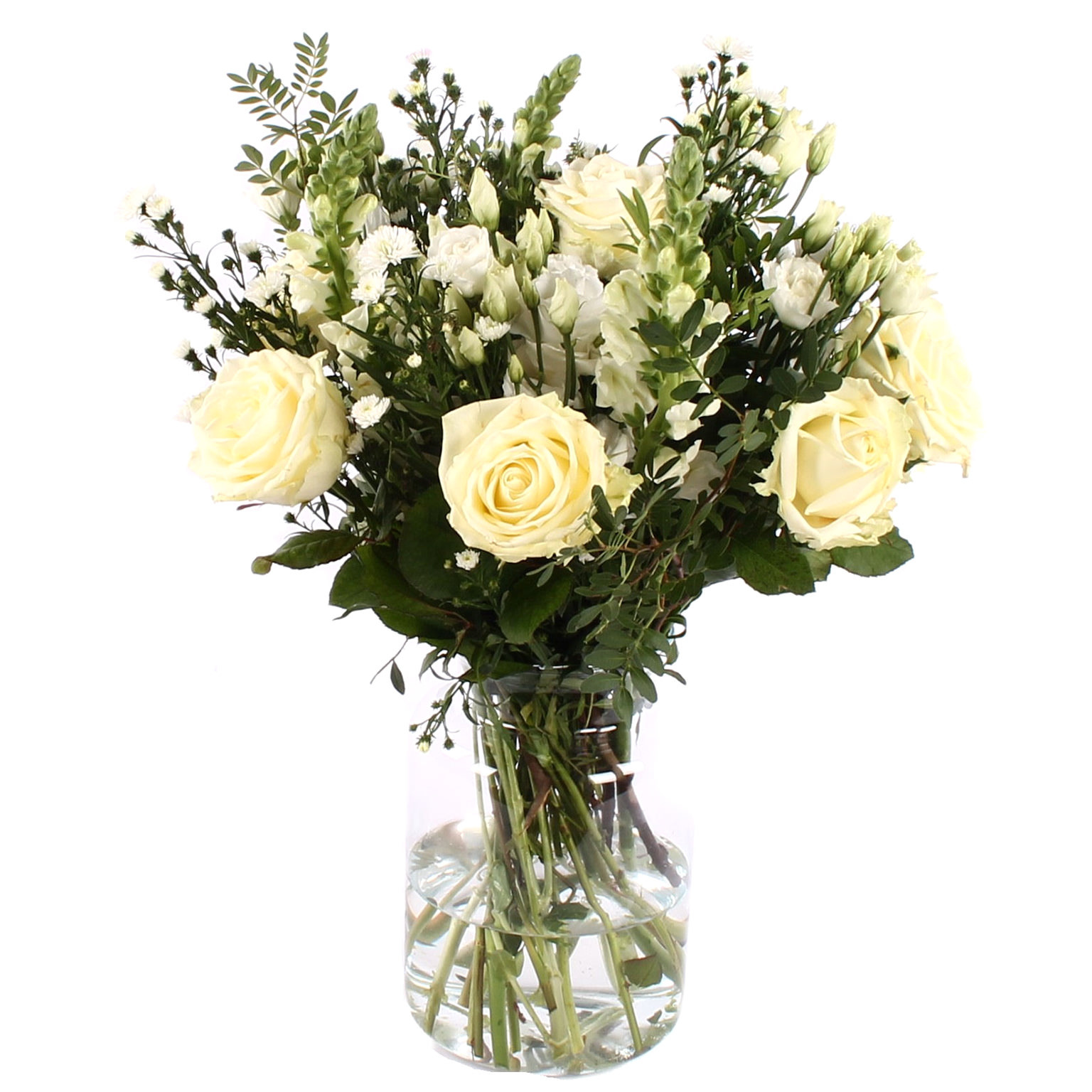 Nabestaanden boeket samengesteld met witte rozen en witte bloemen door de lokale bloemist. In de afbeelding ziet u de ‘Groot’ variant. Dit boeket heeft een steellengte van ca 40 cm. Een rouwlint, -kaart of vaas kunt u in de volgende stap toevoegen.