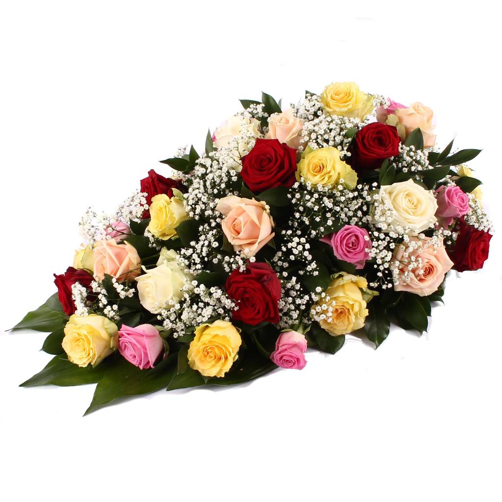 Rouwdruppel gemixte Rozen met Gipskruid. Dit rouwstuk is beschikbaar in een ‘Groot’ variant en heeft een lengte van ca 60 cm. Een rouwlint of -kaart kunt u in de volgende stap toevoegen. Meer info →