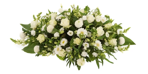 Rouwstuk met witte rozen en witte bloemen. Kies eenvoudig een lint of rouwkaart er bij.