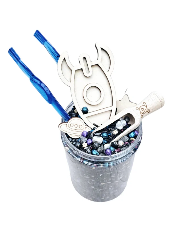 Deze spectaculaire pot, gevuld met ongeveer 1200 gram aan buitenaards materiaal, bevat alles wat kinderen nodig hebben om hun eigen kosmische avonturen in de sensorische speelbak te creëren. Bouw je eigen sterrenstelsel, ontdek verre planeten en laat je verbeelding de ruimte in schieten! Perfect om kleine astronauten en sterrenkijkers te inspireren en de zintuigen te prikkelen. ?✨