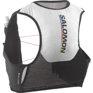 - 2 fleszakken aan de voorkant: deze voorzakken zijn ontworpen voor Salomon softflasks en beperken het stuiteren. Met de elastische lussen bovenaan kunnen de softflasks worden vastgezet.