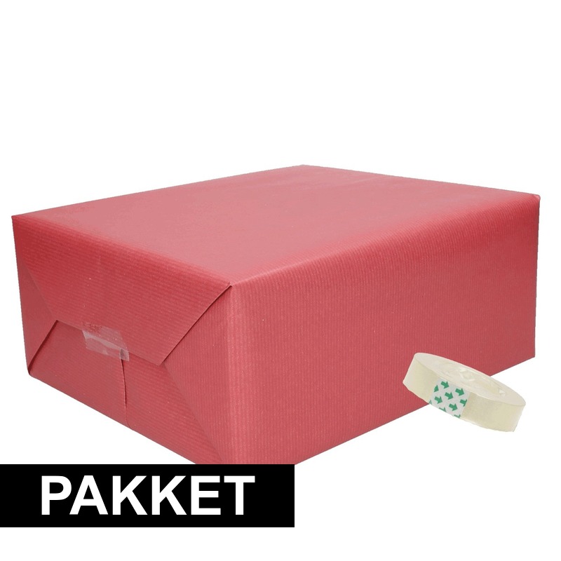 3x Kraft inpakpapier inclusief rolletje plakband. Dit pakket bevat 3 rollen donker rood inpakpapier en 1 rolletje plakband. Het inpakpapier word geleverd op rollen en hebben de afmetingen van 70 x 200 cm. Het rolletje plakband bevat 33 meter plakband en is ongeveer 12 mm breed. , Dit artikel bestaat uit:, 1x Plakband rol – 1x – voor in plakbandhouder – transparant – 1.2 cm x 33 m – tape, 3x Cadeaupapier rood kleurig – 500 x 50 cm – kadopapier / inpakpapier – 60 grams