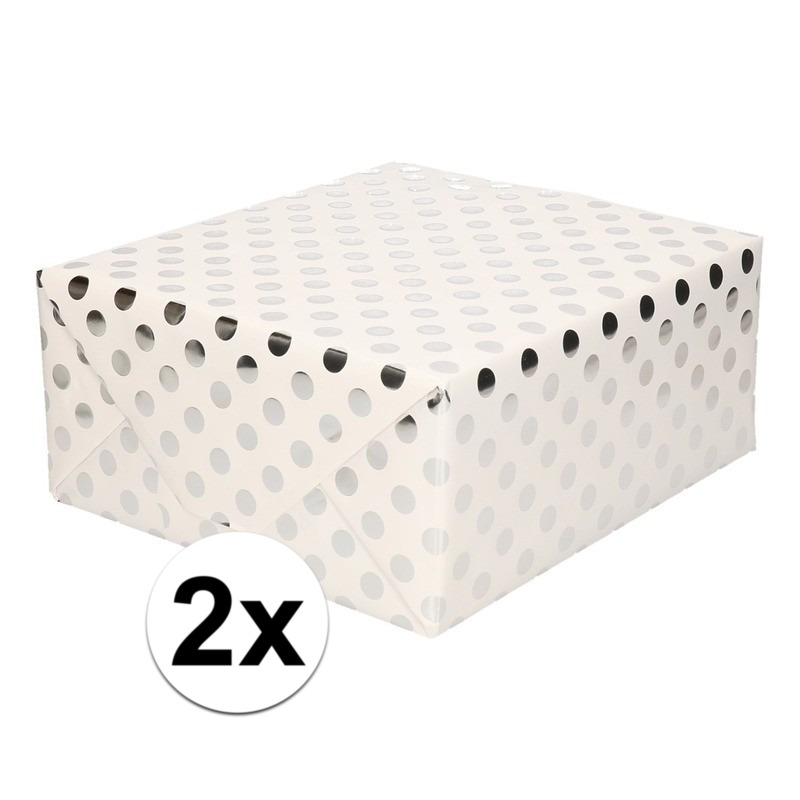 2x luxe folie inpakpapier/cadeaupapier/geschenkpapier, wit met zilveren stippen print. Materiaal: folie. Afmeting papier: ca. 200 x 70 cm. Luxe folie inpak/geschenk/cadeaupapier voor als het echt een luxe uitstraling moet hebben met een mooie glans.