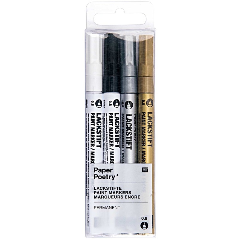 4x Luxe verf markeerstiften in de kleuren zilver/goud/wit/zwart met een puntdikte van 0.8 mm. Deze contourstiften zijn ideaal voor het ontwerpen en decoreren van verschillende oppervlakken, zoals cadeaupapier, kerstkaarten en verschillende DIY-projecten. De pennen hechten aan tal van oppervlakken, zoals glas, plastic, metaal, hout en porselein. Bovendien zijn de permanente, dekkende kleuren waterdicht en lichtecht en zijn ze ook geschikt voor donkere oppervlakken. Op oliebasis. Lijndikte: 0.8 mm. Kleur: goud, zilver, wit en zwart. Dekking: dekkend. Hobbymateriaal/knutselmateriaal hobbystiften metaalstiften/keramiekstiften. Glasstiften/porseleinstiften om mee te tekenen.