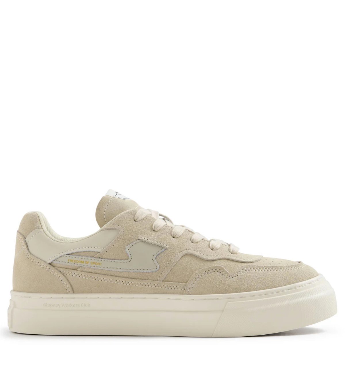 De schoen heeft een mix van leren en suède panelen, wat zorgt voor een stijlvolle en dynamische uitstraling. Het beige leren S-Strike panel op de zijkant voegt een krachtig contrast toe en benadrukt het iconische ontwerp.