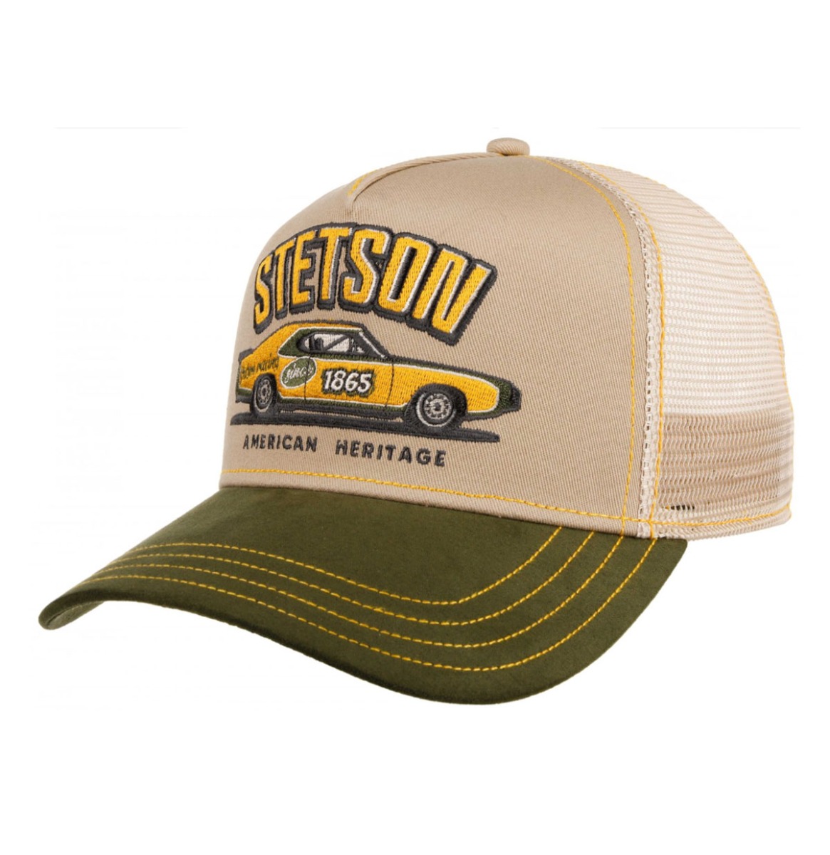 Bekijk product bij Fiftiesstore.nl — bestel vandaag nog en ontvang de Stetson Trucker Pet Racing Groen Beige snel thuis.