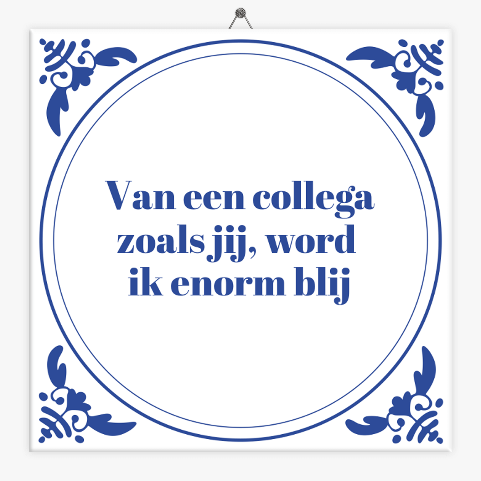 Een goede collega is goud waard! Heb jij zo´n onmisbare collega waar je heel blij van wordt? Geef dan dit spreukentegeltje als cadeau. Leuk om te geven wanneer je een collega wilt bedanken of wanneer een collega afscheid neemt. Pas het tegeltje eventueel naar wens aan en voeg bijvoorbeeld de naam van de collega toe aan het tegeltje. Klik op ‘Ontwerp tegeltje’ om alle mogelijkheden te bekijken voor het maken van dit tegeltje.
