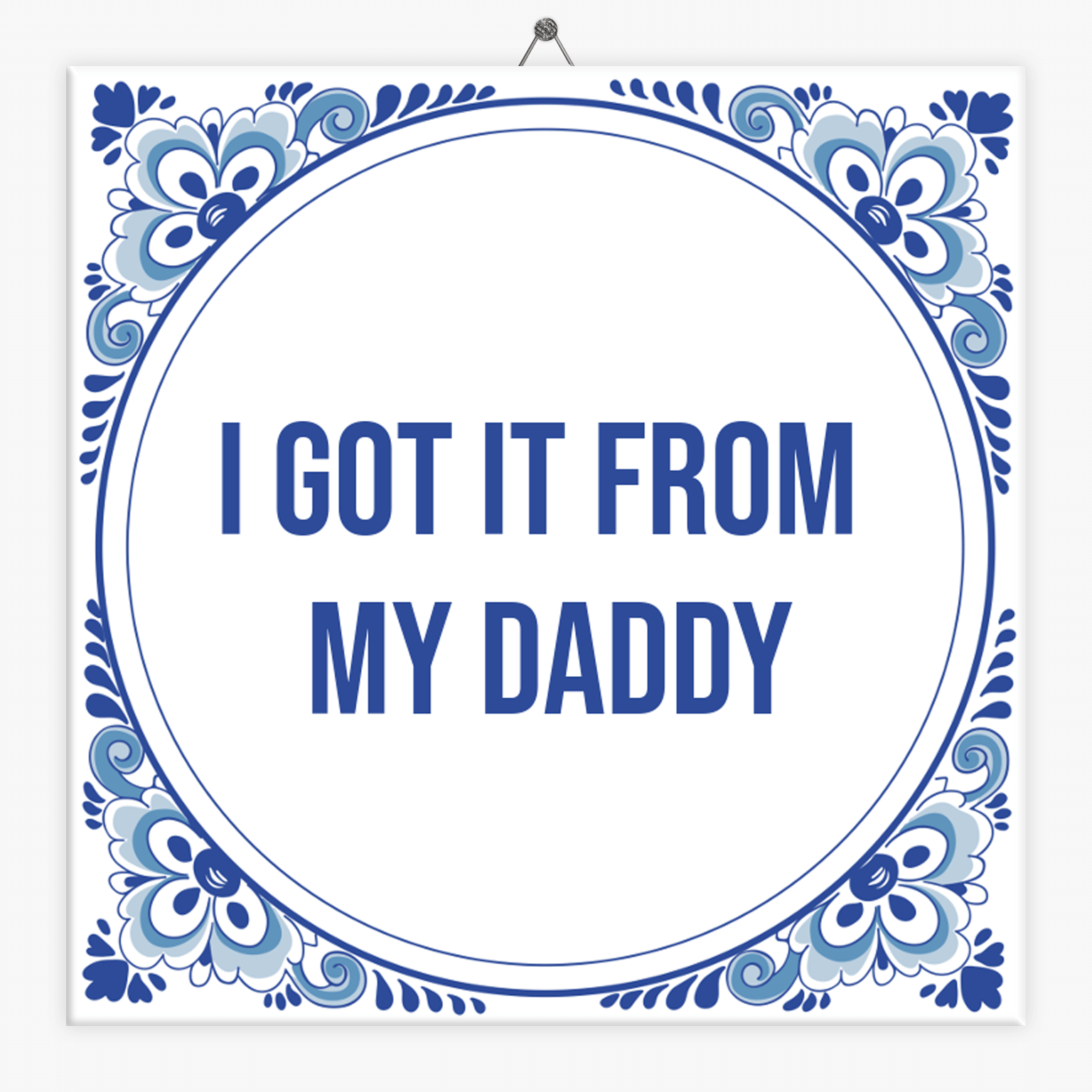 Heb jij jouw geweldige persoonlijkheid te danken aan je vader? Laat het hem dan weten met dit leuke tegeltje met de tekst ´I got it from my daddy´. Dit tegeltje is het ideale geschenk om op een speelse manier je vader te bedanken voor alles wat hij voor je doet en heeft gedaan. Verras jij jouw vader met een leuk tegeltje? Personaliseer dit tegeltje naar wens in de editor. Klik op ‘ontwerp tegeltje’ en start met jouw eigen ontwerp.