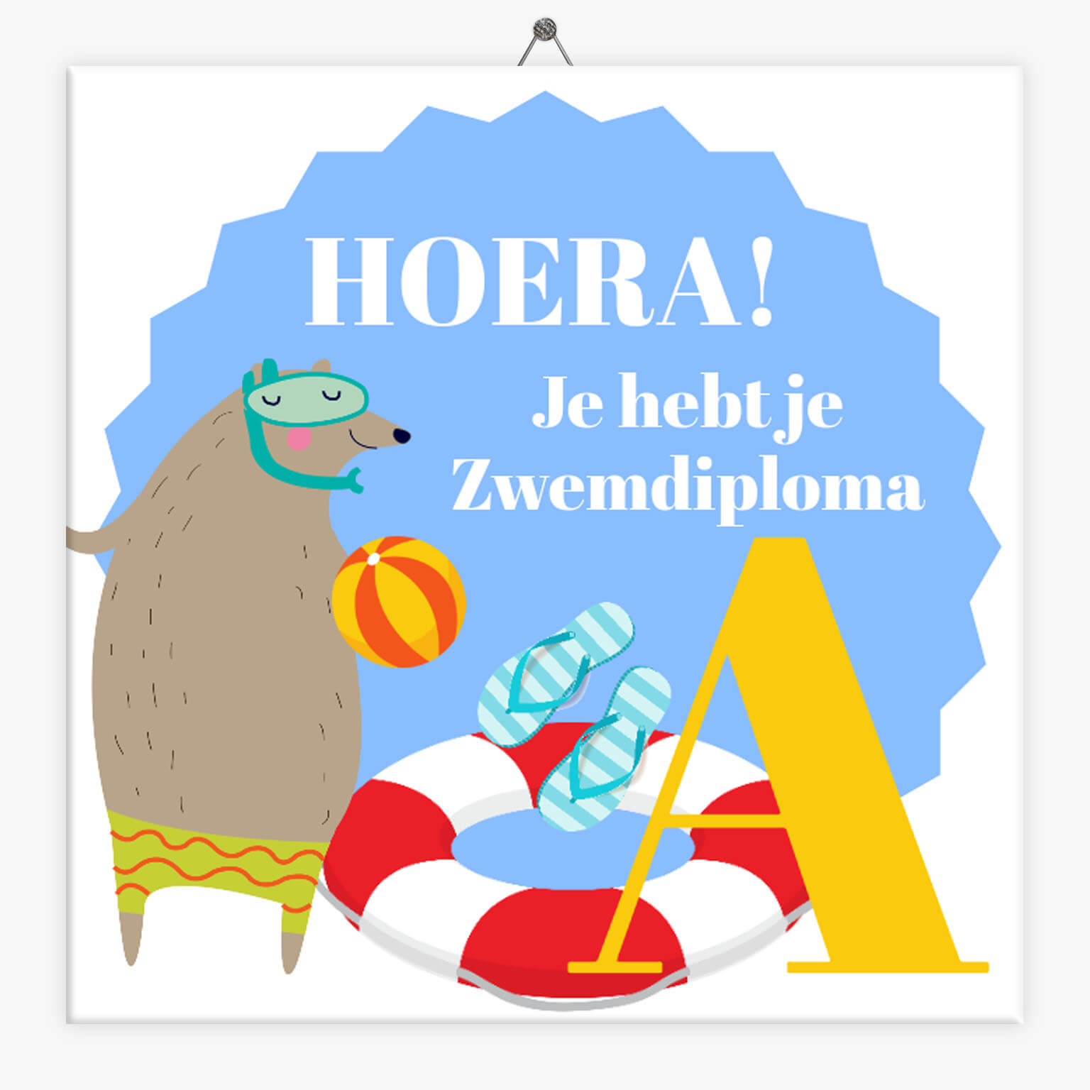 Een leuk geschenk voor iemand die gaat afzwemmen voor zwemdiploma A? Geef een uniek tegeltje met de tekst ´Hoera je hebt je zwemdiploma A´ als cadeau. Het behalen van een zwemdiploma is hard werken en deze mijlpaal mag niet zomaar voorbij gaan. Laat diegene weten hoe trots je op hem of haar bent en verras met een zwemdiploma tegeltje. Klik op ‘ontwerp tegeltje’ om te zien wat de mogelijkheden zijn voor dit tegeltje.