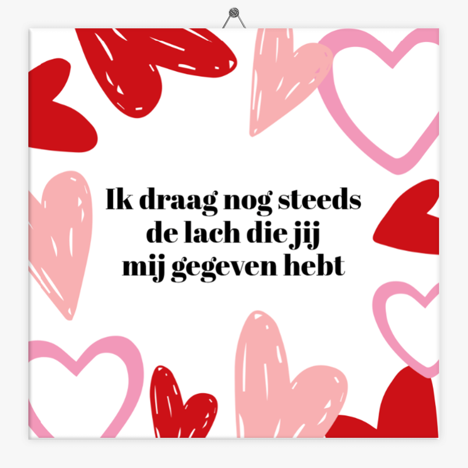 Het ideale tegeltje om een jouw geliefde mee te verrassen. En daarnaast ook een zeer geschikt exemplaar om te geven aan iemand anders die je liefhebt. Een leuk en liefdevol tekst tegeltje, wat tegelijkertijd een compliment is naar de ontvanger. Valentijnsdag vieren met een bijzonder en persoonlijk cadeau? Pas bijvoorbeeld dit valentijn tegeltje design naar wens aan en blaas jouw liefde omver met dit geschenk wat écht raakt. Klik op ”ontwerp tegeltje” om de mogelijkheden van dit tegeltje ontwerp te bekijken.