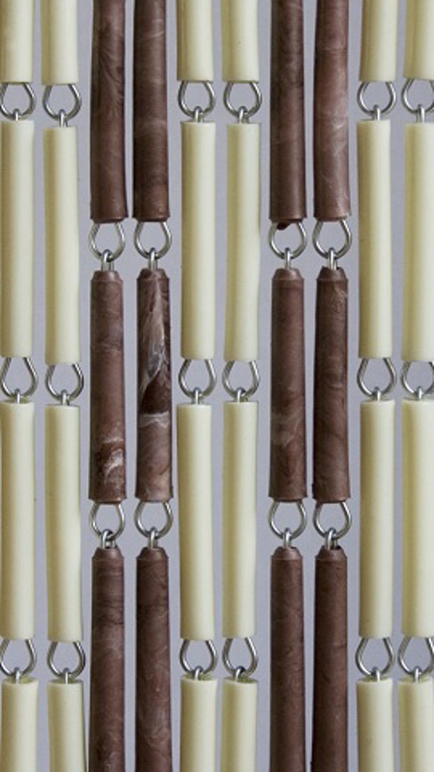 Kant en Klaar vliegengordijn bestaande uit 2 kleuren: creme en bruin-gevlamd. De banen verspringen, zoals op de foto te zien is. Het vlam effect op de bruine hulzen geeft het vliegengordijn een luxueuze uitstraling.