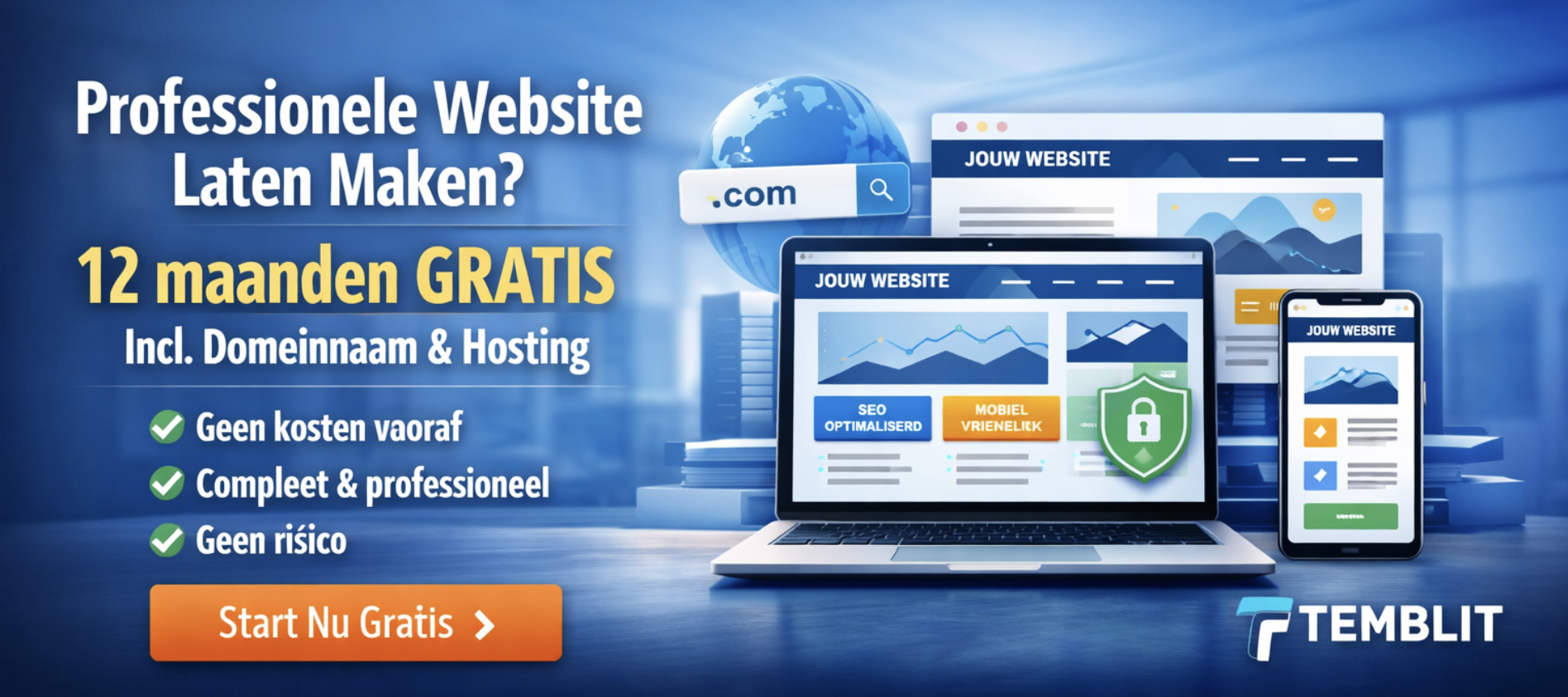 Via Temblit start je 12 maanden gratis, inclusief domeinnaam en hosting.