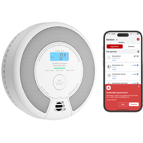 De SC07-MR onderscheidt rookalarm en koolmonoxide-alarm met verschillende alarmtonen. Zo hoor je direct welk type gevaar er is. Het alarm heeft een geluidssterkte van minimaal 85 dB, waardoor je ook ’s nachts wordt gewaarschuwd.